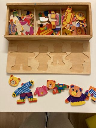Divertido puzzle de madera con piezas para vestir a los osos. Fomenta la creatividad y la imaginación. - Incluye varias piezas de ropa y accesorios. - Base de madera con siluetas de osos.