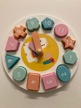 Juguete educativo de madera con diseño de reloj y piezas de puzzle. - Piezas con números del 1 al 12. - Diseños de animales y cactus en el centro. - Colores vivos y atractivos.