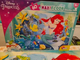 Puzzle MaxiFloor de Disney Princess con Ariel y sus amigos del mar. Es un puzzle de doble cara, NUEVO, es un puzzle normal y otro puzzle diferente en blanco y negro para pintar - 60 piezas. - Tamaño: 70x50cm. - A partir de 4 años. - Marca: Lisciani.