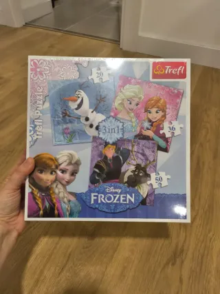 Pack de tres puzzles de Disney Frozen de la marca Trefl. - Puzzle de 20 piezas con Olaf. - Puzzle de 36 piezas con Elsa y Anna. - Puzzle de 50 piezas con Kristoff, Sven y el logo de Frozen.