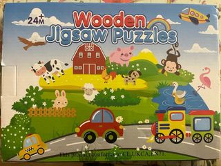 Set de puzzles de madera ideal para niños a partir de 24 meses. Fomenta el desarrollo de habilidades motoras finas y la resolución de problemas. - Incluye varios animales de granja, formas geometricas, numeros, animales y transportes. - Fabricado en madera. Esta en perfecto estado, es la caja la que esta rota por donde se ve en la foto.