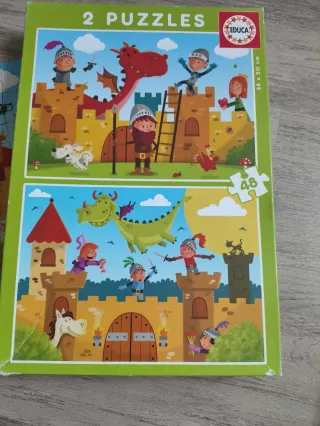 Pack de dos puzzles de la marca Educa con temática de caballeros y dragones. Cada puzzle tiene 48 piezas. - Ilustraciones coloridas de castillos y personajes. - Ideal para desarrollar la motricidad fina y la concentración.