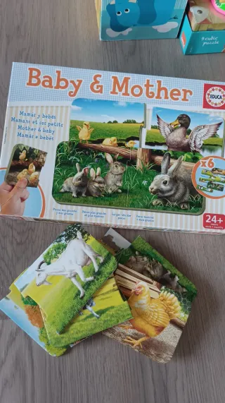 Puzzle de la marca Educa, modelo Baby & Mother. Ideal para niños a partir de 24 meses. - Incluye 6 puzzles individuales. - Temática de animales de granja y sus crías. - Piezas grandes y resistentes.