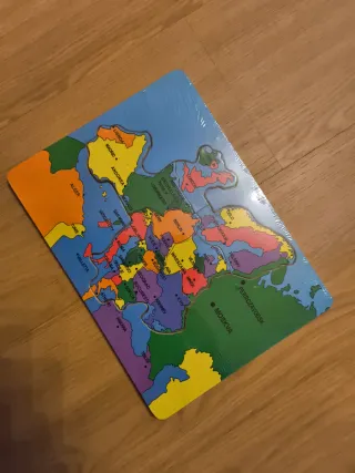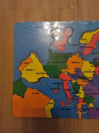 Puzzle de madera con el mapa de Europa, ideal para niños. Presenta los países y capitales con colores vivos. - Piezas de madera. - Mapa de Europa con países y capitales. - Diseñado para el aprendizaje infantil. Sin estrenar, con su envoltorio original. Medidas: 29'5 x 21'5 cm