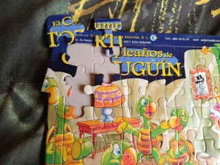 Puzzle infantil El Cumpleaños de Tortuguín. Se trata de un puzle infantil de la colección "Cuentos Tiernos" titulado "El Cumpleaños de Tortuguín". Distribuido por Comics y Cuentos Asturias, S. L. No recomendado para menores de 3 años por contener piezas pequeñas. Publicado por Grupo Editer 88, S. L. - Colección Cuéntos Tiernos de Edibesa.