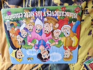 Puzzle de Blancanieves y los siete enanitos. El rompecabezas muestra a Blancanieves y los siete enanitos en un entorno de cuento de hadas. La editora es CODIMA, S.A. Contiene el código de barras 8477655432135. El cuento original es de los hermanos Grimm y se hizo famoso por la adaptación cinematográfica de Walt Disney. - Ilustración colorida de los personajes. - Advertencia: No recomendado para menores de 3 años por contener piezas pequeñas.