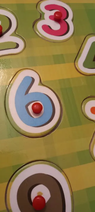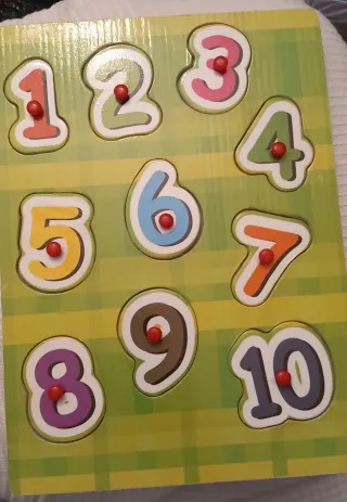 Puzzle de madera con números del 1 al 10, ideal para que los más pequeños aprendan. - Piezas de madera con números de colores. - Cada número tiene un pin para facilitar su agarre. - Base de madera y cartón con los huecos para cada número.