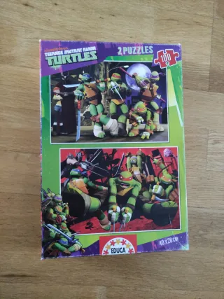 Pack de dos puzzles de las Tortugas Ninja. - Cada puzzle tiene 100 piezas. - Marca Educa. - Tamaño aproximado: 40 x 28 cm. Falta una pieza del puzzle de fondo rojo