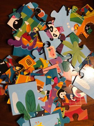 Puzzle de 100 piezas de la marca Djeco, con temática de observación y un póster incluido. Ideal para desarrollar la atención y la paciencia. Usado 1 vez. - Ilustración colorida y detallada. - Piezas de cartón resistente.