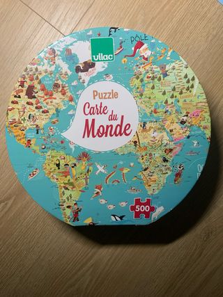 Puzzle circular de la marca Vilac con un mapa del mundo ilustrado. - Diseño Carte du Monde. - 500 piezas.