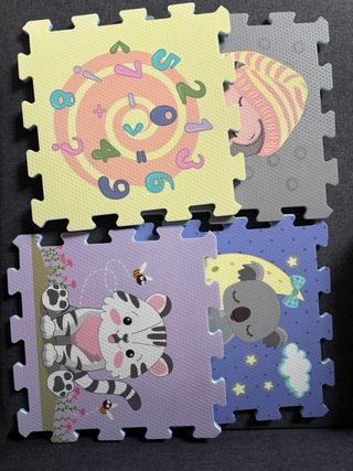 Set de 4 tapetes de espuma entrelazables para juegos infantiles. Cada tapete tiene un diseño diferente. - Un tapete con números y espiral. - Un tapete con un koala durmiendo bajo la luna. - Un tapete con un tigre y abejas. - Un tapete con un personaje abstracto.