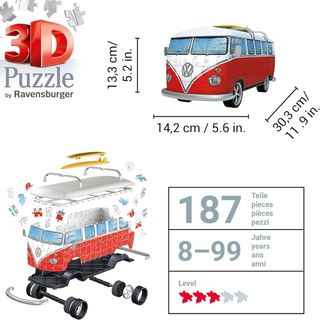Puzzle 3D de la icónica furgoneta Volkswagen T1 de Ravensburger. Ideal para coleccionistas y amantes de los puzzles. - Piezas de alta calidad. - Diseño detallado de la furgoneta. - Incluye instrucciones. Ravensburger - Puzzle 3D Adultos Furgoneta Volkswagen | Puzzles 3D para Adultos Y Niños De 10 Años O Más | Maquetas para Montar De 162 Piezas | Regalos Niños 10 Años O Más