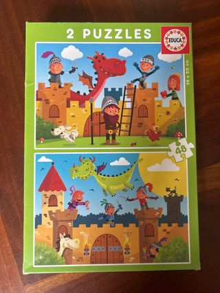 Pack de dos puzzles de la marca Educa con 48 piezas cada uno. Las imágenes muestran escenas de caballeros, dragones y castillos. - Incluye dos puzzles. - Cada puzzle tiene 48 piezas. - Diseño infantil con temática de caballeros y dragones.