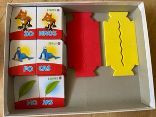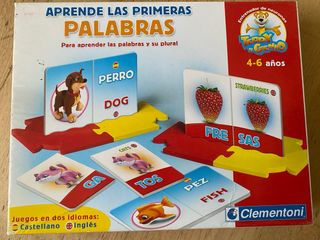 Juego de mesa bilingüe (español e inglés) para niños de 4 a 6 años. Perfecto para aprender vocabulario básico y plurales. Incluye tarjetas con imágenes y palabras en ambos idiomas y piezas de espuma para encajar. El juego está en buen estado. - Aprende palabras en español e inglés. - Ideal para niños de 4 a 6 años. - Incluye tarjetas y piezas de espuma. Posiblidad de traerlo a BCN zona maternidad.