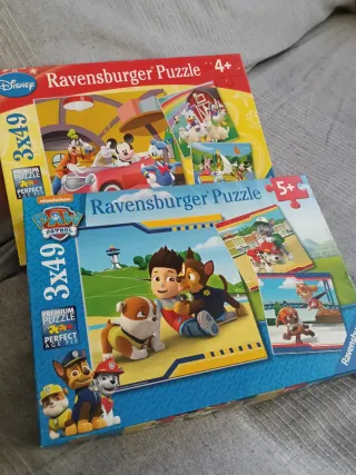 Dos puzzles Ravensburger, uno de Disney y otro de Paw Patrol. - Puzzle Disney con personajes como Mickey Mouse y Goofy. - Puzzle Paw Patrol con los cachorros de la Patrulla Canina. - Ambos puzzles son de 3x49 piezas. - Aptos para mayores de 4 y 5 años respectivamente.el precio es de los 2