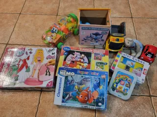Lote variado de juegos infantiles. - Coche con bloques de construcción. - Camión volquete amarillo. - Peluche de perro. - Coche rojo. - Puzzle de Barbie. - Puzzle de Disney Mickey y amigos. - Puzzle de Disney Nemo. - Juego de mesa Color Cubes. - Juego de pesca de madera.