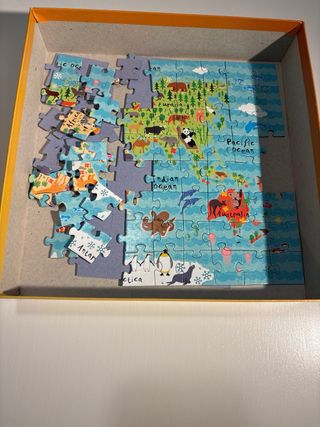 Puzzle infantil Mapa del Mundo de Playtive. Fomenta la motricidad fina y el reconocimiento de las formas. - 104 piezas. - Ilustraciones de animales y continentes. - Edad recomendada: 5+ años.