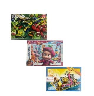 Nuevos en su embalaje original. Lote de 3 puzzles: • Puzzle JUNGLE ANIMALS 1000 piezas. • Puzzle 3D POP Out World 92 piezas. • Puzzle Maxi MASHA AND THE BEAR. 60 piezas.
