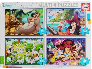 Pack de 4 puzzles de Disney de la marca Educa. Cada puzzle tiene un número de piezas diferente: - 🐻 El Libro de la Selva – 50 piezas - 🧚 Peter Pan – 80 piezas - 🐶 101 Dálmatas – 100 piezas - 🎩 Alicia en el País de las Maravillas – 150 piezas Todos los puzzles están completos y en perfecto estado, como nuevos. Perfectos para estimular la concentración y disfrutar en familia.