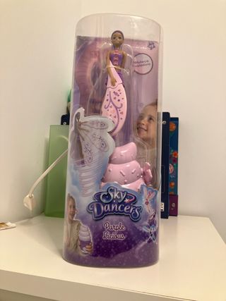 Muñeca voladora de la colección Sky Dancers, modelo Purple Licious. - Incluye figura de muñeca. - Diseño con temática de tornado y pastel. - Colores predominantes: morado y rosa.
