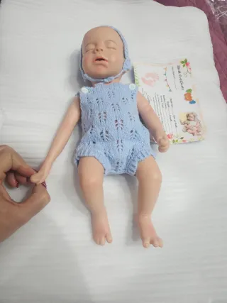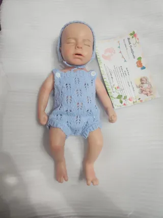 Precioso bebé reborn de silicona suave y flexible se puede bañar.Pintado a mano .Ojos cerrados con pestañas y boca abierta. Incluye certificado de autenticidada de nacimiento y peto con gorrito.