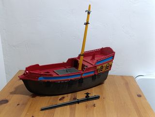 Carrocería de barco galeón de Playmobil en color rojo y azul. Ideal para coleccionistas o para añadir a un diorama. Tal como se ve en las fotos - Diseño detallado de galeón. - Colores rojo, azul y negro. - Mástil amarillo incluido.