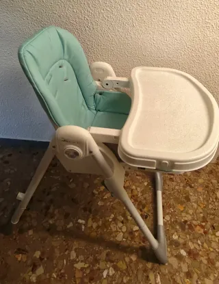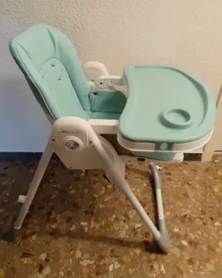 Trona de bebé en color menta, ideal para las comidas, meriendas o cenas. - Asiento acolchado. - Bandeja extraíble. - Reposapiés. - Estructura plegable. - Varias alturas - Asiento reciclable
