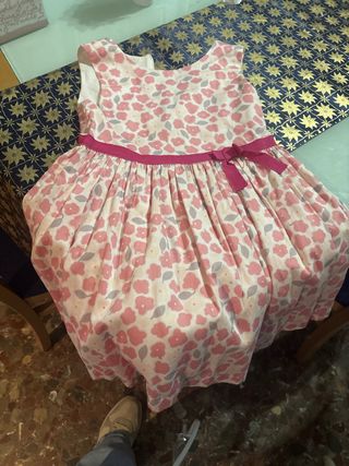 Vestido de niña con estampado floral, ideal para ocasiones especiales. Talla 5-6 años. - Diseño sin mangas. - Cintura marcada con detalle de lazo. - Estampado de flores rosas y hojas grises sobre fondo blanco.