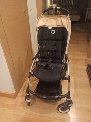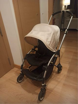 Cochecito Bugaboo Bee en color beige y negro. Es ligero y fácil de maniobrar. - Capota extensible. - Asiento reclinable. - Ruedas todoterreno. - Tamaño perfecto para ascensor pequeño y maletero coche - Protector asiento aparece en la foto incluido - También se añade el cuco por 30€ adicionales El manillar cuando se extiende arriba no se bloquea porque hay un pieza rota (interna del mecanismo), el recambio de Bugaboo cuesta unos 15€. El color negro de los laterales del asiento está ligeramente deteriorado como se ve en la foto. Todo lo demás está en perfecto estado.