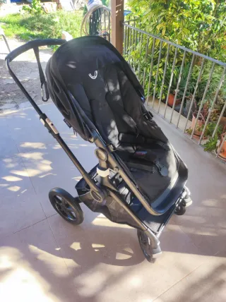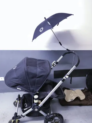Cochecito de bebé Bugaboo en color negro, ideal para paseos cómodos. - Incluye capota. - Incluye sombrilla. - 3 fundas sillas de recambio ( negra, gris y beige) - 2 capotas extensibles [ negra y beige] - 1 cesta de compra - Capazo