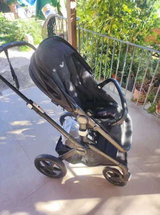 Con capota y sillita. Capota ventilada. Cesta porta objetos. Unico defecto una de las ruedas ni frena del todo esta desgastada pero venden recambio del freno muy barato. Y la fudna del mango desgastado del uso.