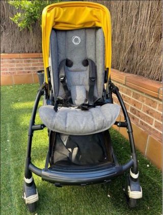 Carrito de bebé y capazo Bugaboo Bee 5 en color amarillo y negro, con un recambio A ESTRENAR de la parte exterior del capazo. - Capota extensible en color amarillo. - Asiento negro acolchado. - Cesta de compras inferior. Tiene el agarre un poco desgastado, lo demás perfecto.
