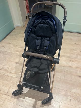 Cochecito Cybes Mios (rose gold y azul marino), comprado en el 2021. Apto des del nacimiento hasta los 4 años. Capazo con muy poco uso (tengo vestiduras). Silla en dos orientaciones y reclinable (tengo saco de invierno y de entretiempo en rosa y blanco, y de florecitas). Incluye plástico de lluvia nuevo a estrenar. Algun roce en los laterales del chasis de subirlo al maletero del coche. Tiene el regulador de posiciones del asiento partido, pero funciona igual. Venden la pieza de recambio a parte.