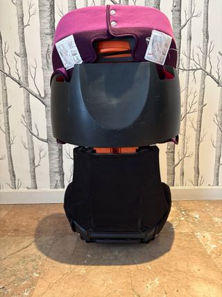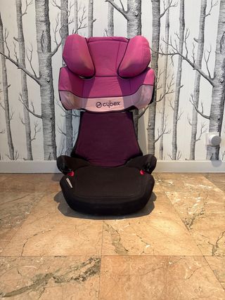 Silla de coche Cybex para niños de 3 a 12 años. Diseñada para ofrecer seguridad y comodidad. - Tapicería en color rosa y morado. - Reposacabezas ajustable. - Base en color negro. la tela está gastada en la parte baja. Venden recambios.
