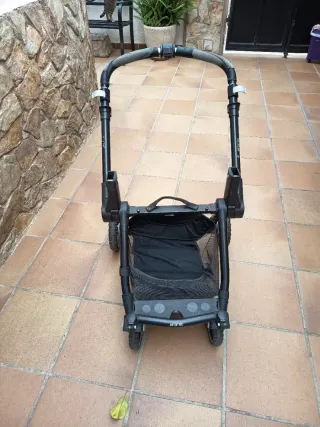 Chasis de la silla de paseo Jané Kendo, sirve para recambios o se puede reparar, NO SE PLEIGA LADO IZQUIERDO, frenos y manillar en perfecto estado. - Incluye chasis, SIN RUEDAS. - Color negro. - Empuñadura de cuero sintético marrón.