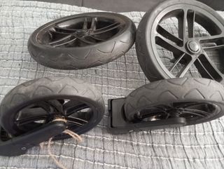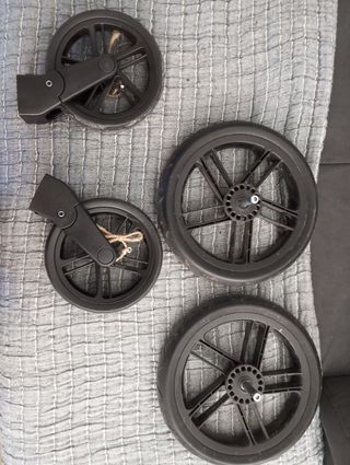 Ruedas delanteras y traseras de carro Jane muun. Están completamente nuevas, se han usado muy poco porque compré una silla nueva. No tienen ni grietas ni nada de nada. En las delanteras les he puesto una cuerda para no perder las tuercas y arandelas que vienen en el propio carro que se los he quitado por si hacían falta. Las delanteras costaron 39€ y las traseras 75€ en la apagina oficial de recambios de Jane.