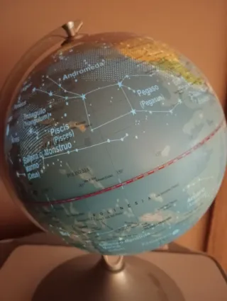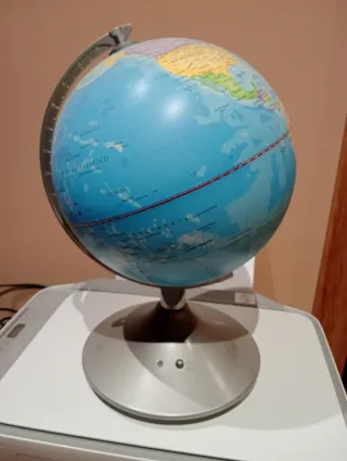 Globo terráqueo con base para colocar en escritorio o estantería. - Diseño a todo color. - Soporte metálico. - Base redonda.