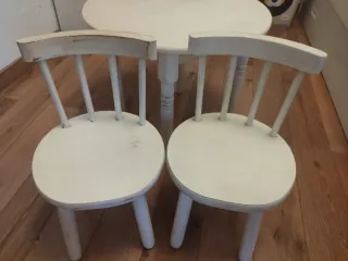 Conjunto de mesa redonda y dos sillas (todo de manera)para niñ@s. - Mesa de color blanco (50cm alto y 58cm de diámetro) - Sillas de color blanco con respaldo curvo (30 cm de alto).