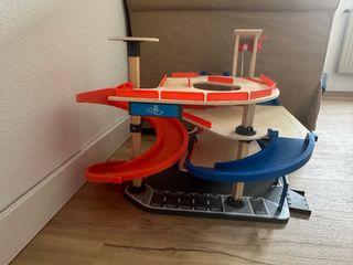 Divertido garaje y circuito de coches de madera. - Construcción de madera. - Incluye rampas y niveles. - Diseño colorido con detalles de aparcamiento.