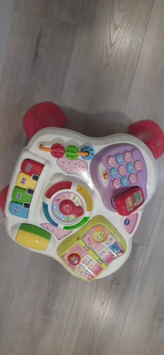 Mesa de actividades Vtech con panel extraíble, 6 zonas interactivas. Permite desarrollar diferentes habilidades (números, letras, colores, animales, notas musicales, rutinas diarias, y más). Tiene varios objetos para manipular, como un teléfono, un libro interactivo, ruleta para rutinas diarias, un rodillo, engranajes,... Tiene más de 30 canciones, melodías, sonidos y frases; control de volumen; desconexión automática. Las patas se desmontan para poder jugar sentado y facilitar el almacenamiento.