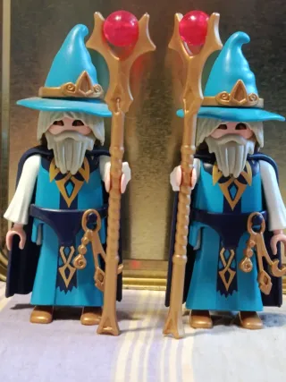 2 Figuras de Playmobil de un mago de la serie 12. Precio por los dos: 12€ Se hacen envíos por importes superiores a 20€. Se hacen lotes. - Incluye sombrero azul y bastón dorado con gema roja. - Detalle de túnica azul con adornos dorados y cinturón azul oscuro. - Barba y pelo blanco característicos del personaje.