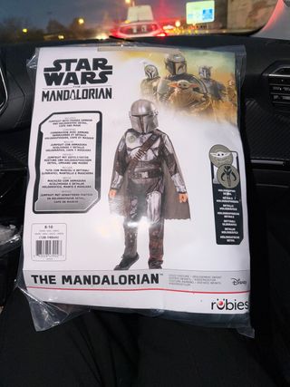 Disfraz de The Mandalorian para niños, talla 8-10 (128-140cm). El disfraz está nuevo y sin usar. - Incluye mono con armadura acolchada y detalle holográfico. - También incluye capa y máscara. - Licencia oficial de Star Wars.