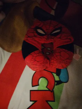 Disfraz de Spiderman para niños, ideal para fiestas o juegos. - Incluye máscara y traje. - La mascara está un poco desgarrada de la tela pero en el chino se puede comprar una. - Diseño clásico de Spiderman con telarañas rojas y azules.
