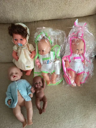 Conjunto de cinco muñecos de diferentes tamaños y apariencias. - Una muñeca con pelo castaño y vestido beige,Marca Vicma año 70 - Dos muñecas en sus embalajes originales con accesorios. - Un muñeco con jersey azul claro, Marca Zapf - Un muñeco pequeño de color marrón.