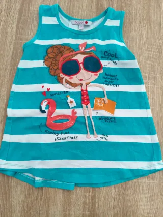 Camiseta de tirantes para niña de la marca Boboli con un divertido estampado veraniego. - Diseño a rayas azules y blancas. - Estampado de niña con gafas de sol, flamenco y detalles. - Tejido cómodo para el verano.