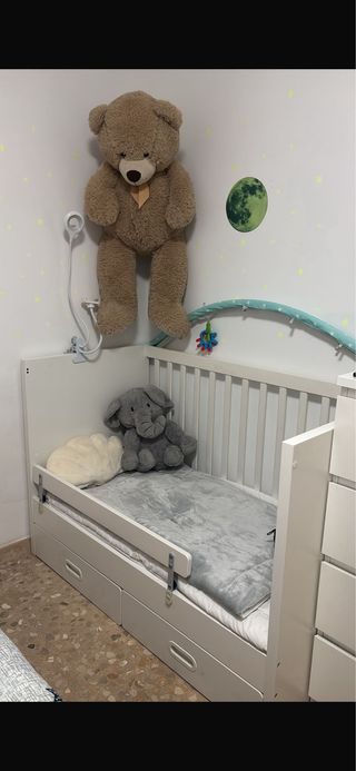 Cuna de bebé en color blanco, ideal para habitaciones infantiles. Cuenta con un diseño funcional y moderno. (No incluye colchón) - Incluye dos cajones en la parte inferior para almacenamiento. - Barrera de seguridad lateral. - Estructura de madera resistente.