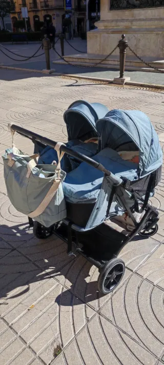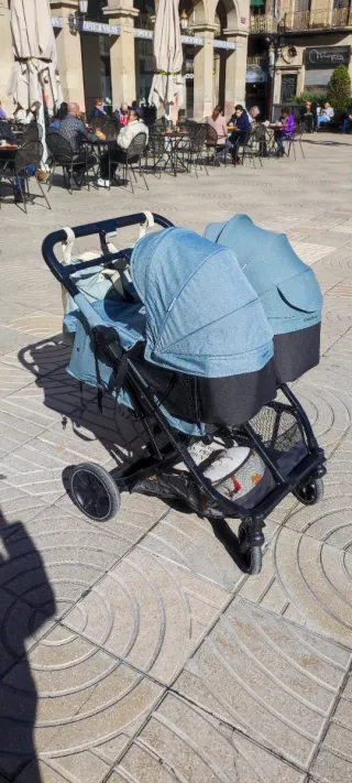 Carro gemelar Casualplay Twin Max en color azul. - Ideal para hermanos con poca diferencia de edad. - Capotas independientes. - Cesta de almacenaje inferior. - Dos capazos - Dos sillas de paseo - Plástico de lluvia
