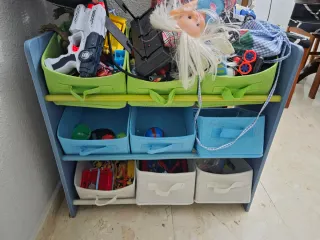 Práctica estantería para organizar juguetes y otros artículos. - Estructura de madera azul. - Tres niveles con cubos de tela. - Cubos superiores de color verde. - Cubos inferiores de color azul y blanco.