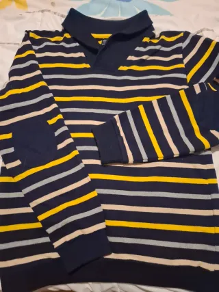 Jersey de manga larga con cuello tipo polo y coderas. - Diseño a rayas en azul marino, amarillo y beige. - Talla 14/16.