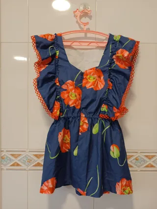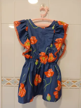 Vestido de celebración para niña de la marca Miranda, talla 5. Presenta un estampado de amapolas rojas sobre fondo azul marino, con detalles de volantes y puntilla roja en las mangas y el escote. La cintura está fruncida para un ajuste cómodo. - Estampado floral de amapolas. - Volantes y puntilla roja. - Cintura elástica. - Dispongo de dos unidades. Una talla 5 y otra talla 4. Una unidad 16€, las dos unidades 30€. - Ideal hermanas, mellizas o gemelas. - Se puede entregar/recoger en Rincón de la Victoria, Vélez Málaga o Zona Pabellón Ciudad Jardín.